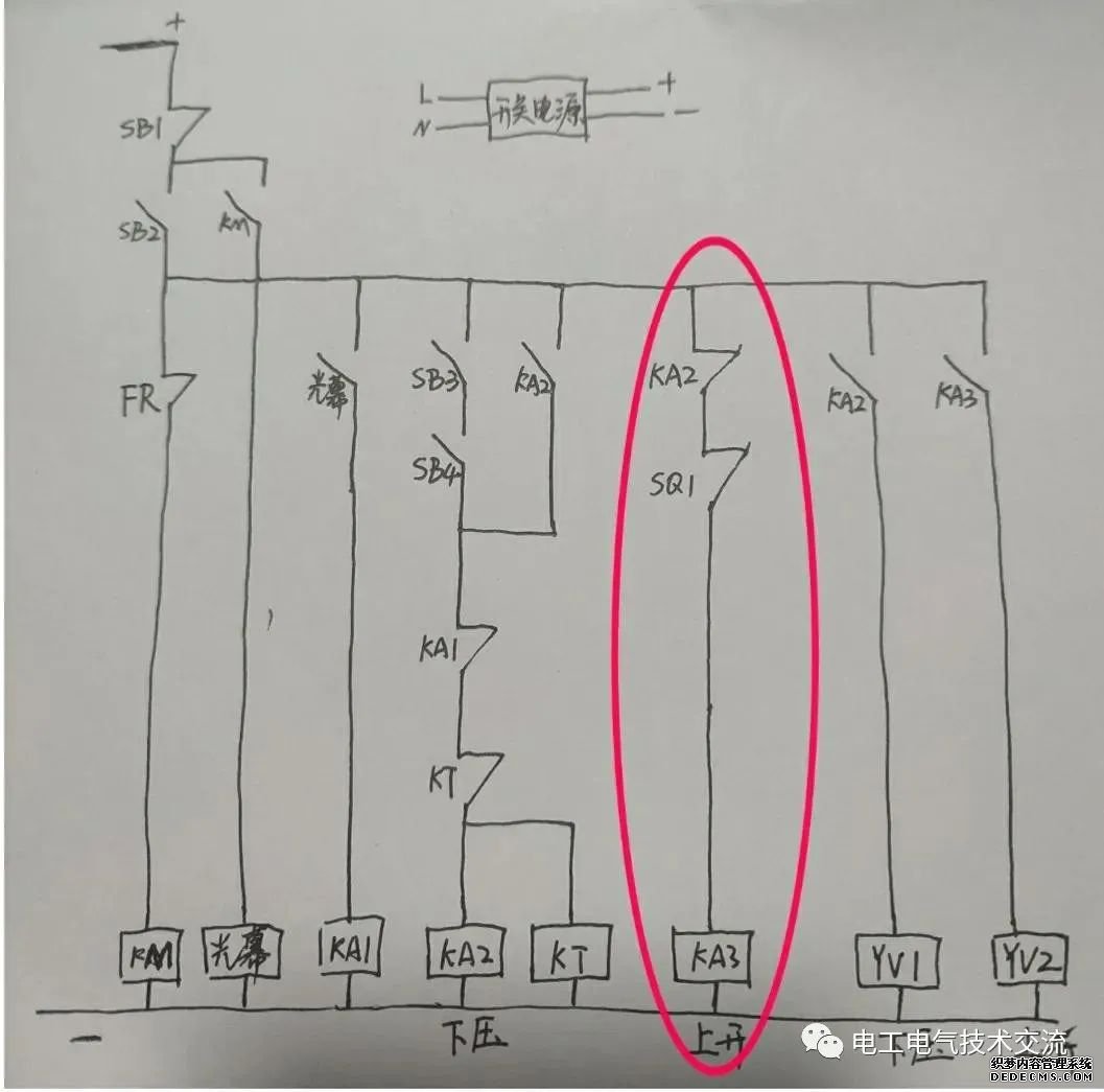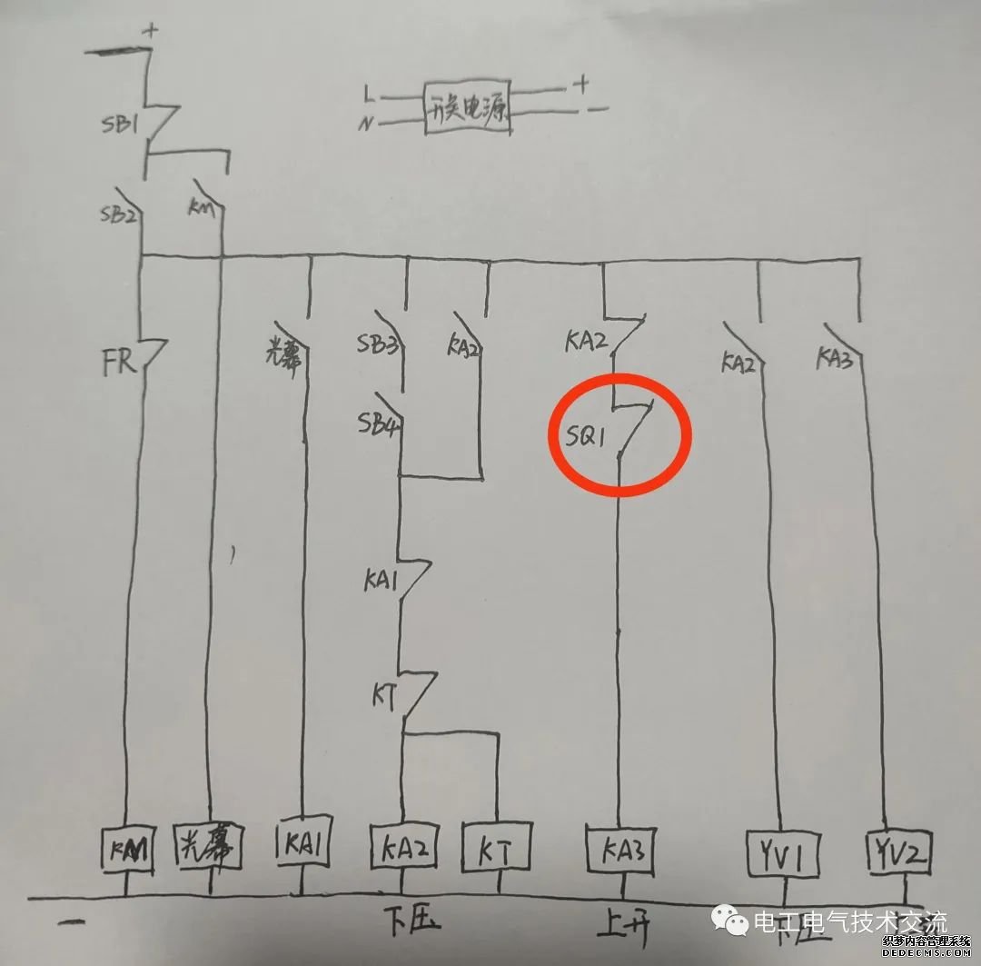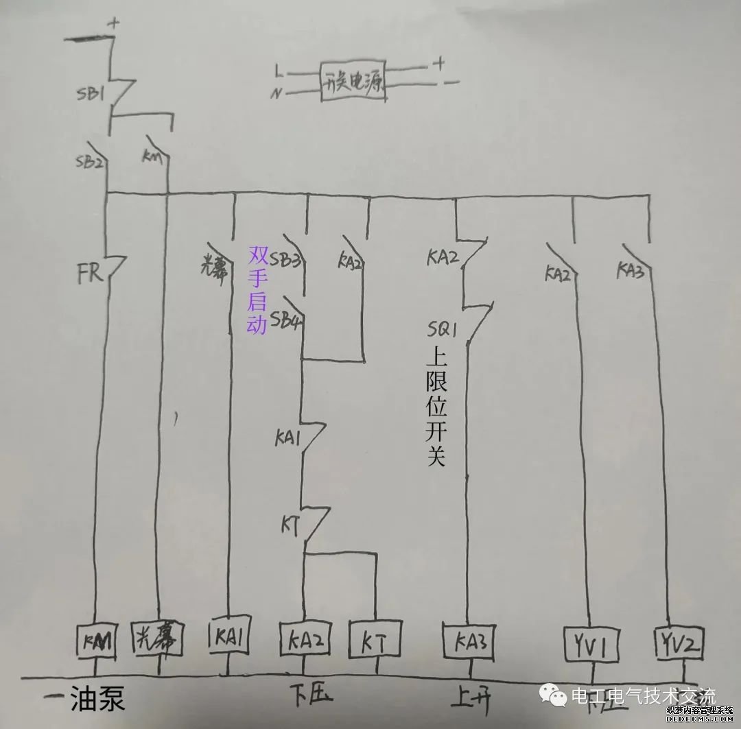 按下啟動按鈕SB2,油泵工作后立即按下雙手按鈕油壓機下壓,松手后,液壓機正常。文章由電工小知識分享電友編著,版權(quán)歸原作者,向電友致敬!